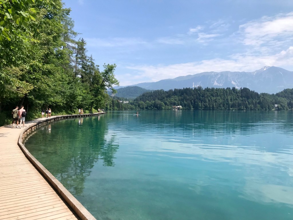 Jezioro Bled, „wizytówka Słowenii”, jedno z najbardziej rozpoznawalnych miejsc tego kraju. Samo jezioro ma ponad 2 km długości i 1,3 km szerokości, a jego objętość sięga 30 metrów. Powstało pod koniec ostatniego zlodowacenia. Wokół jeziora biegnie 6 kilometrowa, wygodna ścieżka umożliwiająca podziwianie wyspy Blejski Otok z kościołem Maryi Wspomożycielki oraz zamku na wzniesieniu z różnej perspektywy. Są też liczne ławeczki po drodze umożliwiające odpoczynek, a także miejsca do plażowania. Na chętnych czekają przewoźnicy oferujący rejsy tradycyjnymi łodziami zwanymi „Pletna” na wyspę Blejski Otok, gdzie znajduje się kościółek Maryi Wspomożycielki, do którego prowadzi 99 kamiennych schodów. Można również samemu wypożyczyć łódkę lub kajak albowiem nad jeziorem znajduje się sporo wypożyczalni sprzętu wodnego. Dla fanów turystyki rowerowej poprowadzone zostały ścieżki rowerowe.